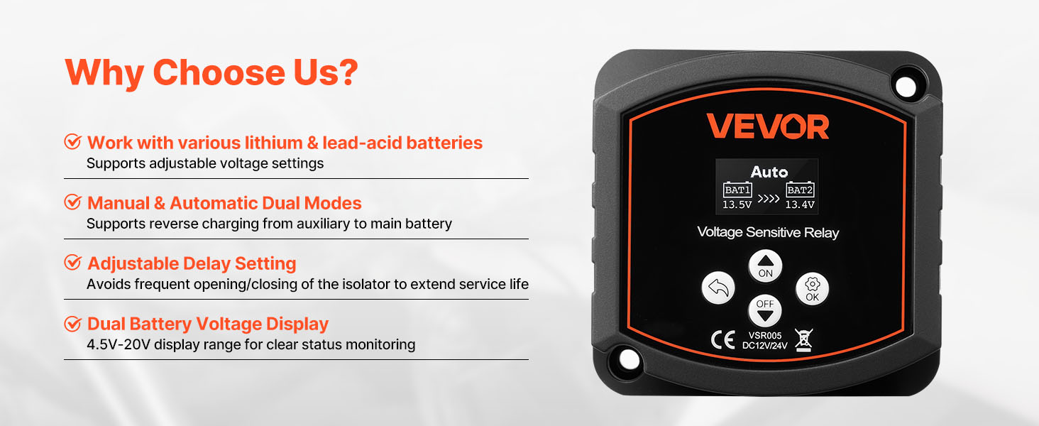 Naše relé citlivé na napätie podporuje nielen flexibilné nastavenie napätia a núdzové reverzné nabíjanie, ale má aj zabudovanú ochranu proti oneskoreniu, aby sa zabránilo stratám pri častom spúšťaní a zastavovaní. Vrátane zobrazenia dvojitého napätia v reálnom čase vás informuje o stave batérie na spoľahlivé používanie.