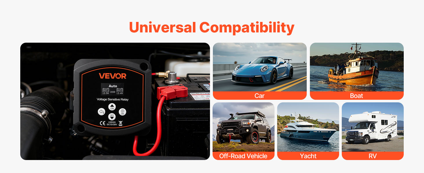 Duálny izolátor batérií automaticky upravuje nabíjacie napätie podľa rôznych typov batérií. Je široko kompatibilný s rôznymi lítiovými batériami a olovenými batériami, čím zabezpečuje efektívnu prácu rôznych typov batérií.