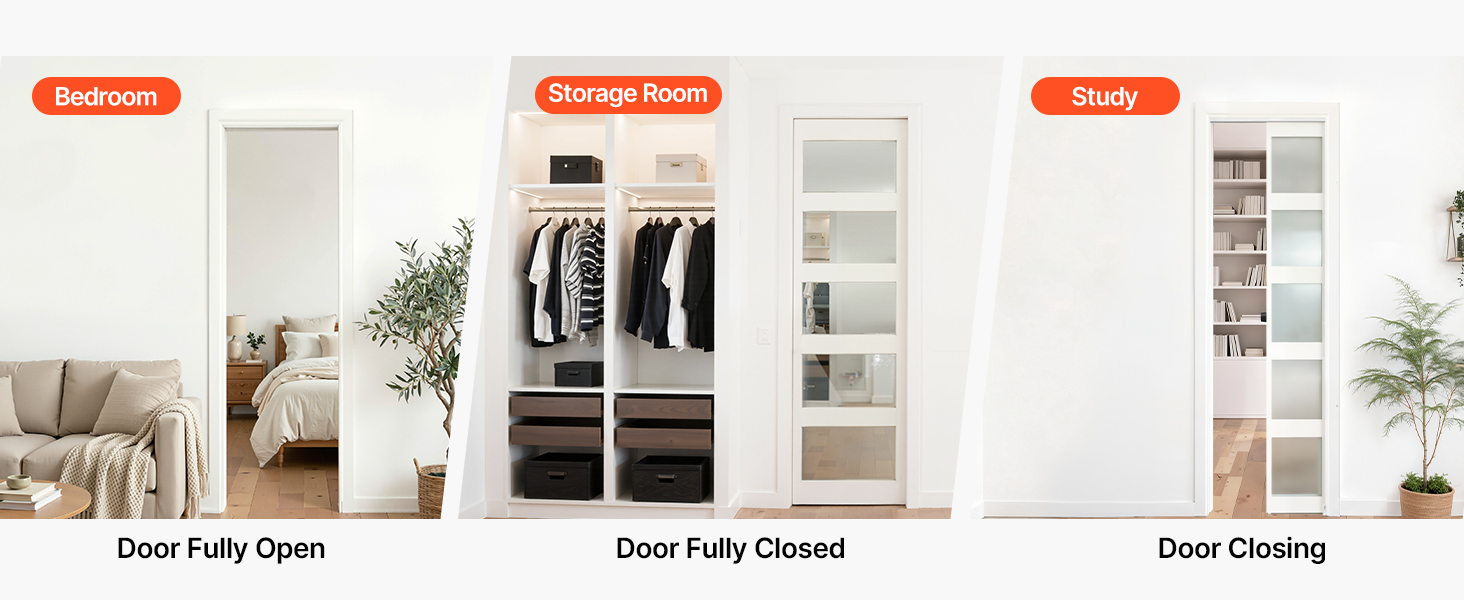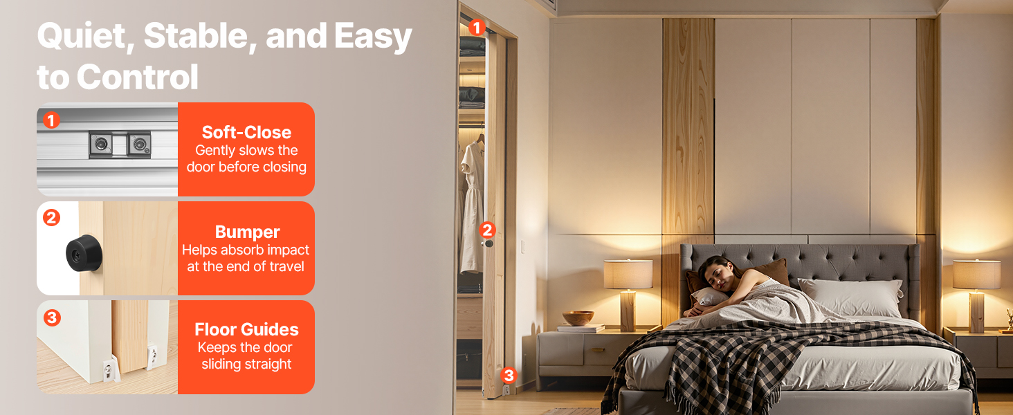 Táto súprava koľajníc a kovania pre posuvné dvere je ideálna pre tiché spálne alebo kompaktné úložné priestory, pretože znižuje priestor potrebný na otváranie dverí a vytvára čistejšie a efektívnejšie usporiadanie.