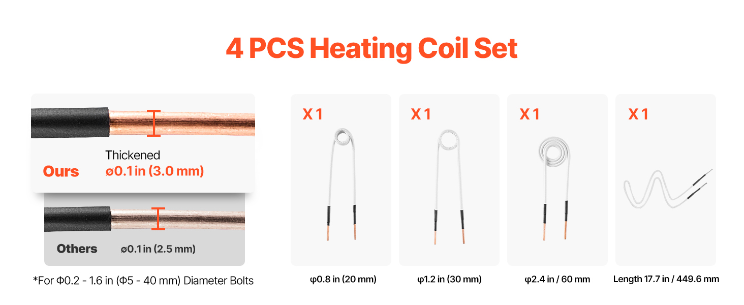 Nástroj na ohrev skrutiek je vybavený viacerými cievkami, ktoré ľahko zvládajú nepravidelné obrobky. Či už ide o malé skrutky alebo väčšie ložiská, poskytuje presné zahrievanie. Fialový medený vodivý drôt je efektívnejší a izolačná vrstva zo sklenených vlákien ponúka vynikajúcu odolnosť proti poškodeniu.