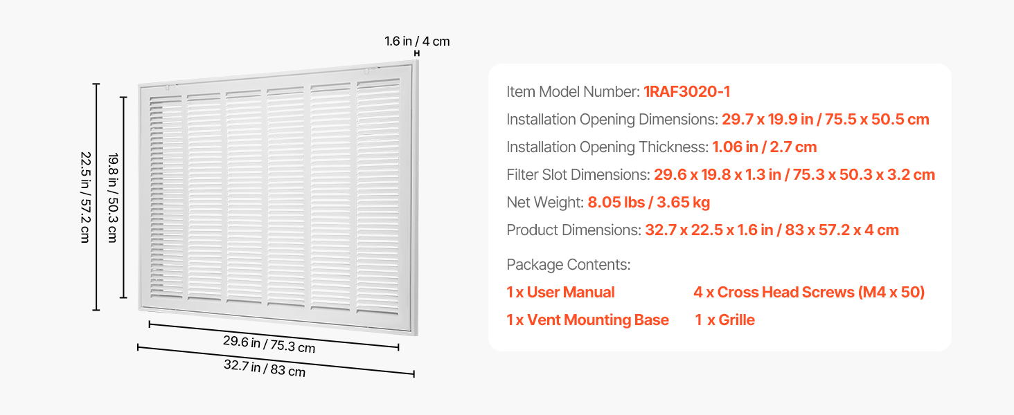 Mriežka spätného prívodu vzduchu 30×20 inch, oceľ, pre 1 inch filter