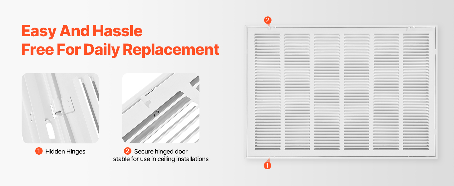 Mriežka spätného vzduchu je vybavená ľahko ovládateľným zámkom pre pohodlné otváranie a zatváranie, čo zjednodušuje čistenie a výmenu. Skryté pánty sú vhodné pre inštaláciu na strop, čím zabezpečujú vysokú bezpečnosť.