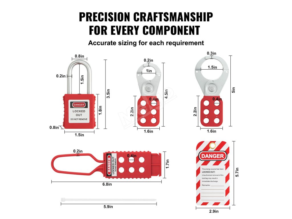 Táto súprava na blokovanie elektrických zariadení obsahuje 4 bezpečnostné visiace zámky, 3 haspony, 30 blokovacích štítkov, 30 nylonových káblových pások, 2 zástrčkové blokovacie štítky, 8 ističov a 1 prenosné puzdro, ktoré poskytuje komplexné riešenie na prevenciu elektrických a mechanických nebezpečenstiev.