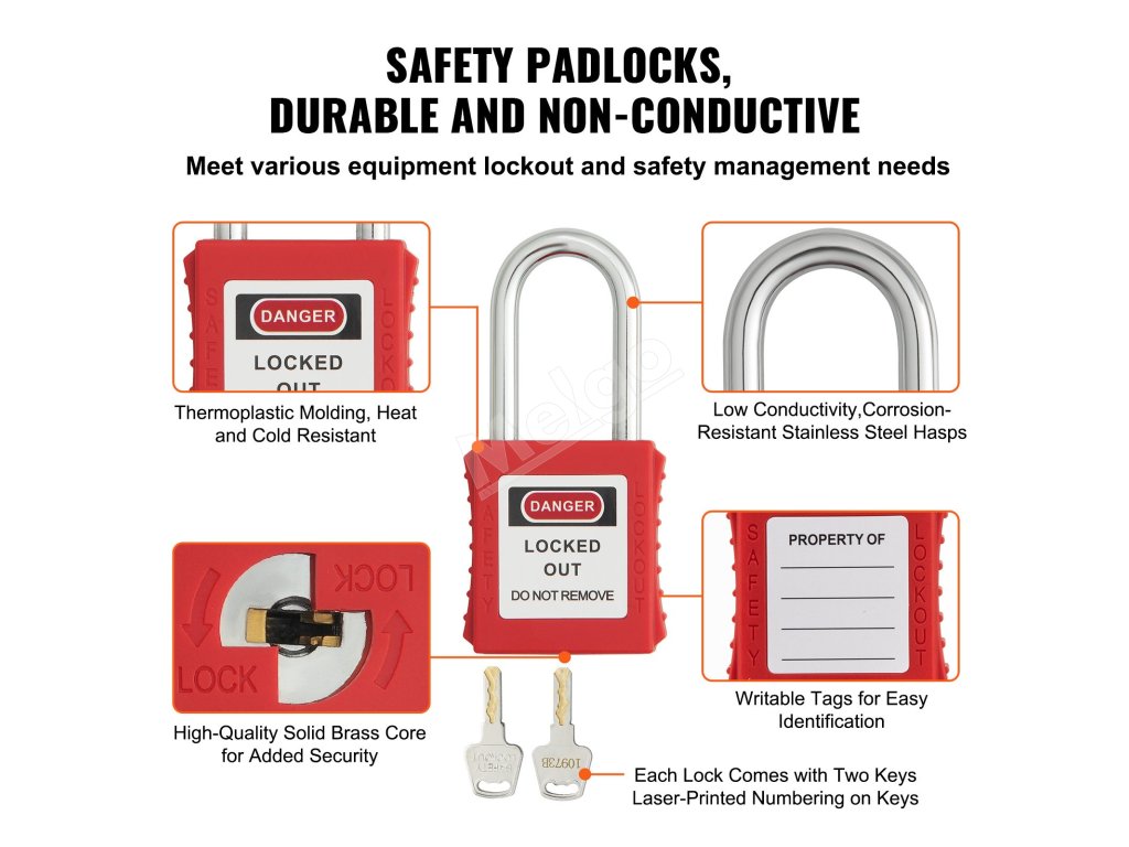 Červené visiace zámky sú nevodivé, termoplastické a vytvarované ako jeden celok. Každý visiaci zámok je vybavený dvoma kľúčmi - jedným na bežné použitie a jedným náhradným, čím sa účinne predchádza zablokovaniu v dôsledku straty kľúčov.