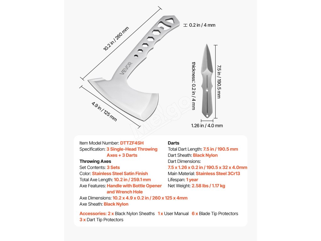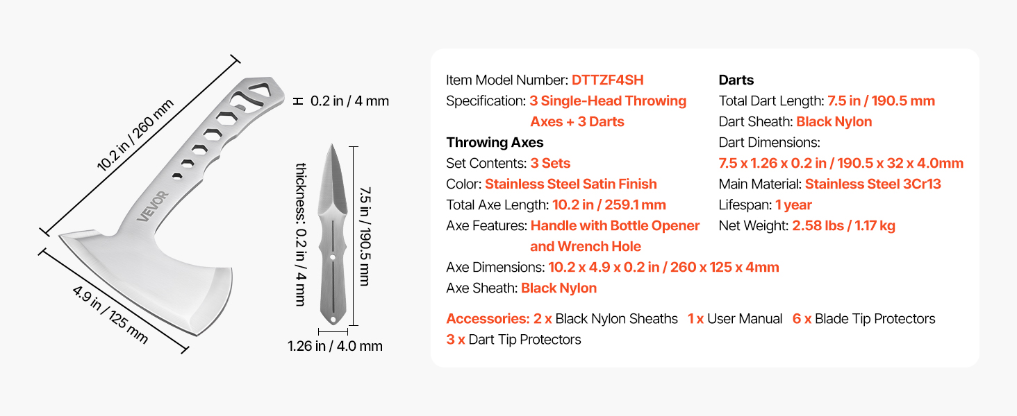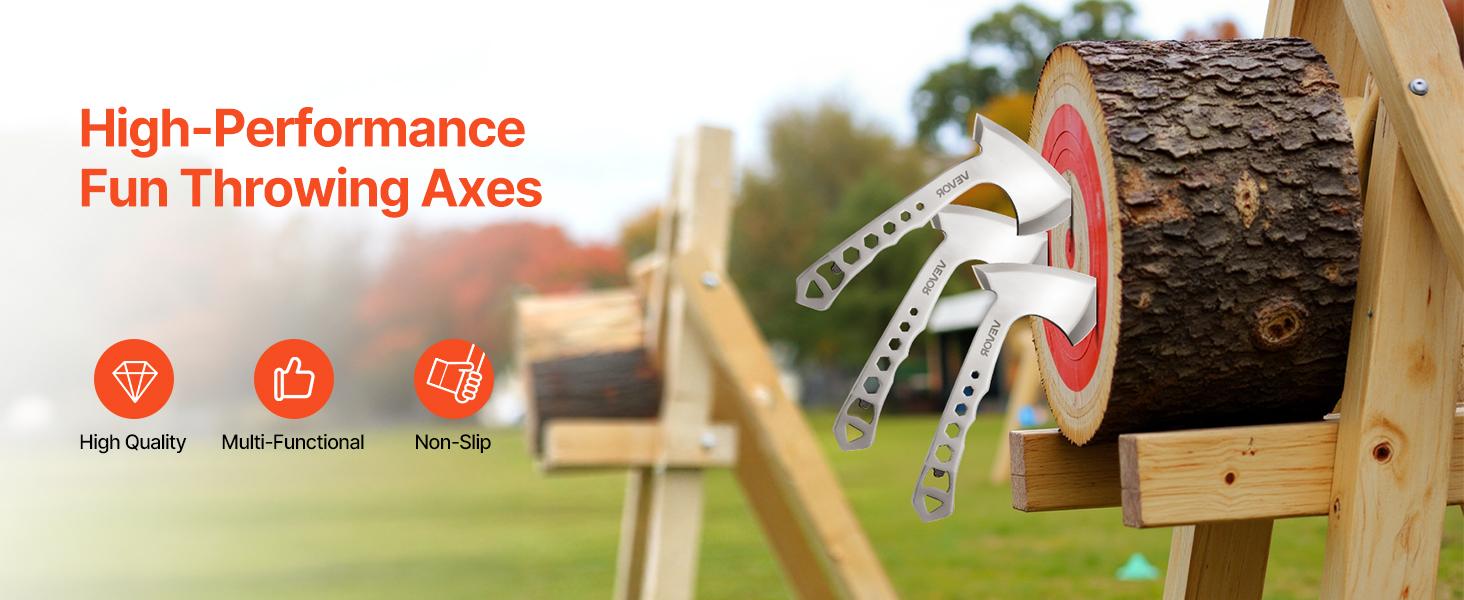 Táto multifunkčná súprava vrhacích sekier je určená pre domácu zábavu a outdoorových nadšencov, vyznačuje sa vyváženým rozložením hmotnosti, odolnými materiálmi a prenosnosťou - ideálna na presné hody a zábavné interakcie na večierkoch, súťažiach a podujatiach v prírode.