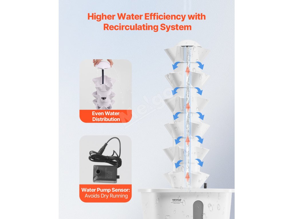 S prietokom 600 l/H poskytuje táto hydroponická veža dostatok kyslíka koreňom rastlín, čím podporuje ich zdravý rast. Výška zdvihu 2 m/6,56 ft zabezpečuje rovnomernú distribúciu vody ku každému rastlinnému struku, čím pomáha rastlinám prosperovať v prostredí bohatom na kyslík.