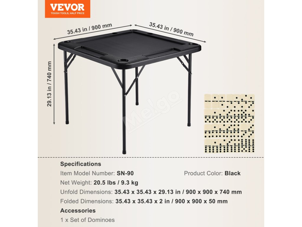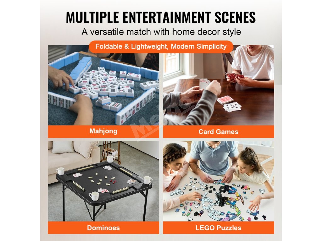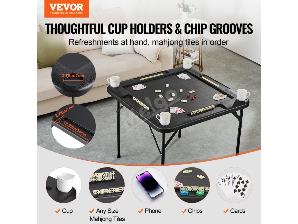 Pozdvihnite svoje stretnutia so skladacím stolom VEVOR na mahjong, ktorý je ideálny na trávenie voľného času s rodinou a priateľmi. Vďaka praktickým držiakom na poháre môžete mať svoj nápoj ľahko nablízku. Odkladacie plochy na žetóny vám navyše umožnia mať telefón, žetóny a karty prehľadne usporiadané a ľahko dostupné.