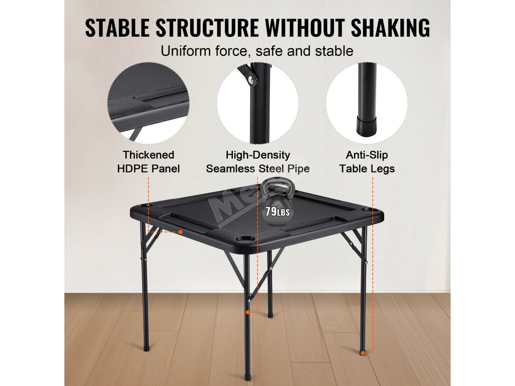 Premyslené detaily zabezpečujú vynikajúcu stabilitu: Vďaka zosilnenej doske z HDPE, bezšvovým oceľovým rúrkam s vysokou hustotou a protišmykovým podložkám pod nohy poskytuje náš štvorcový kartový stôl pre 4 hráčov pevný a bezpečný základ pre isté hranie.
