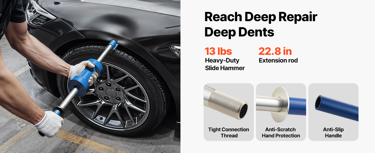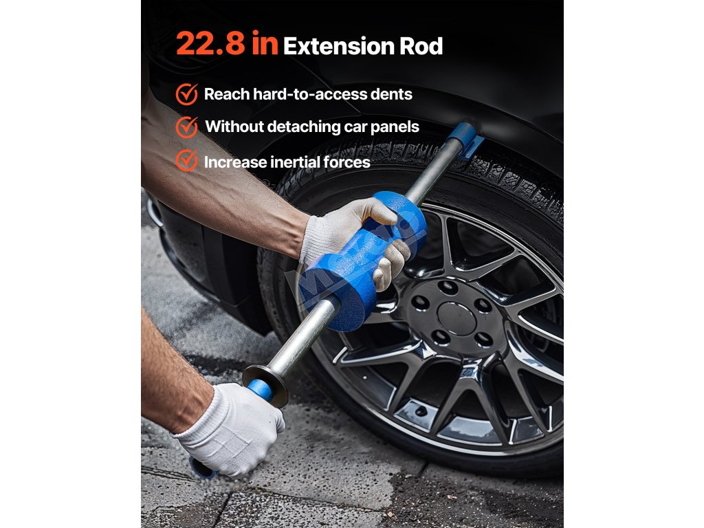 Predĺžená ťahacia tyč v tejto súprave na bezfarebnú opravu preliačin dosiahne do úzkych priestorov a zvyšuje zotrvačnú silu na hlbšie ťahy. V spojení s pevným klzným kladivom opravíte hlboké preliačiny s menšou námahou a väčšou silou.