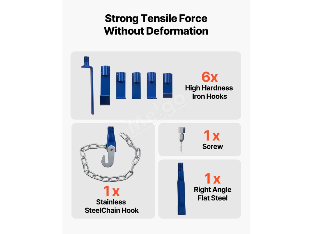 Hák, plochá lišta a reťaz z nehrdzavejúcej ocele sú vyrobené z tvrdeného kovu. Zostávajú pevné a stabilné aj pri opakovanom používaní, vďaka čomu je súprava na odstraňovanie preliačenín spoľahlivá pri opravách s veľkým zaťažením.