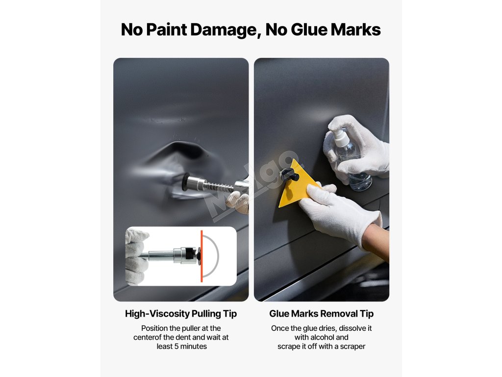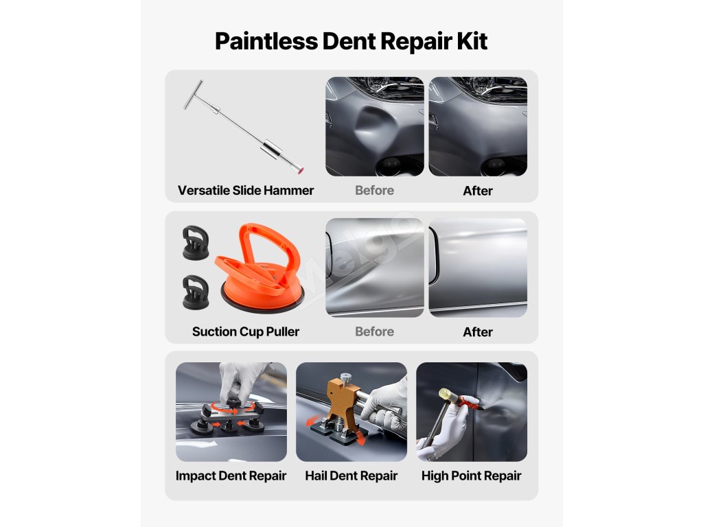 Táto súprava na odstraňovanie preliačin bez laku obsahuje všetko, čo potrebujete na opravu preliačiny aj nárazu. Majitelia áut, ktorí si sami urobia diery, si môžu poradiť s preliačinami doma ako profesionáli - nie je potrebné navštevovať drahé predajne. Ušetrite náklady a čas vďaka riešeniu "všetko v jednom".