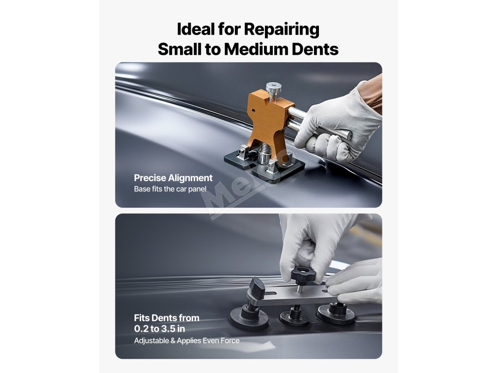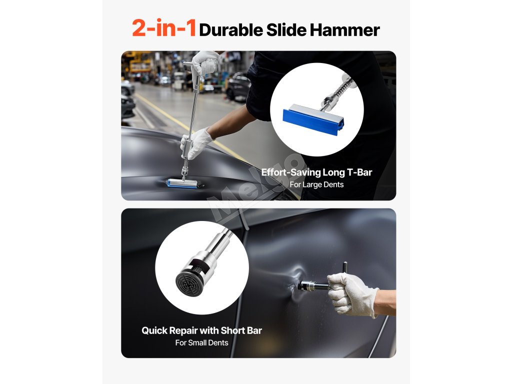 Táto súprava na vyťahovanie preliačin obsahuje predĺženú T-tyč spojenú s posuvným kladivom, ktorá maximalizuje zotrvačnú silu, vďaka čomu je odstraňovanie preliačin rýchlejšie a menej namáhavé.