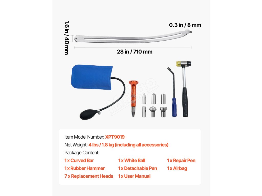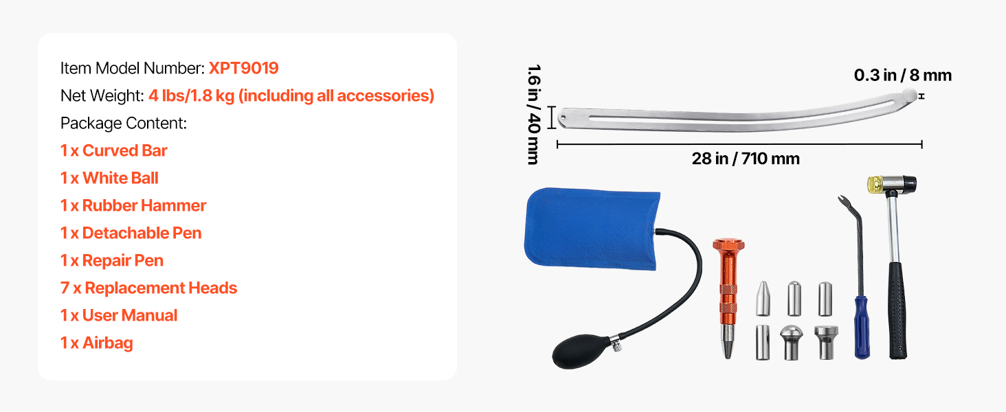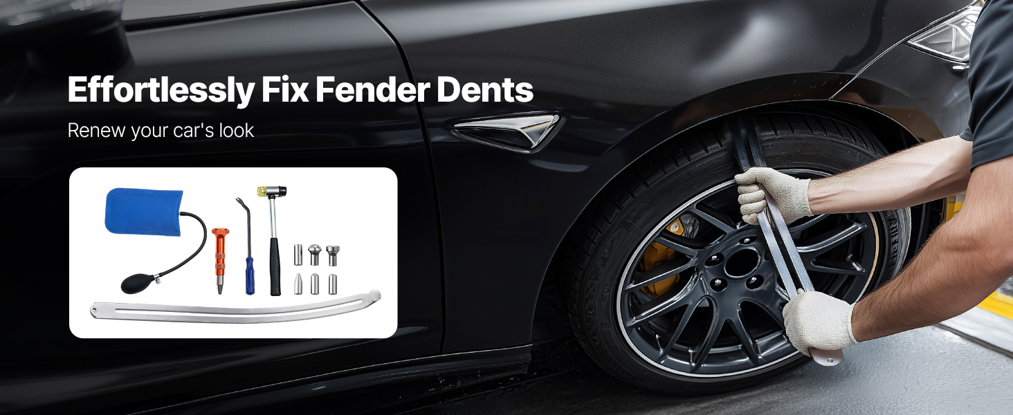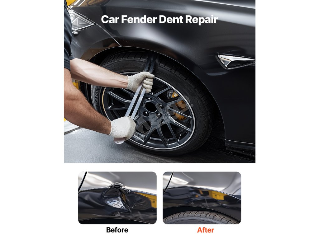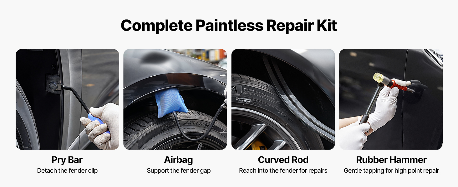 Táto súprava na odstraňovanie preliačin bez laku, ktorá obsahuje všetko potrebné, obsahuje zahnutú tyč, opravné pero so 7 vymeniteľnými hlavicami, páčidlo, vzduchový vankúš a gumové kladivo. Je skvelá pre domácich majiteľov automobilov, ktorí si s preliačinami na blatníkoch poradia doma - nie je potrebná návšteva servisu.