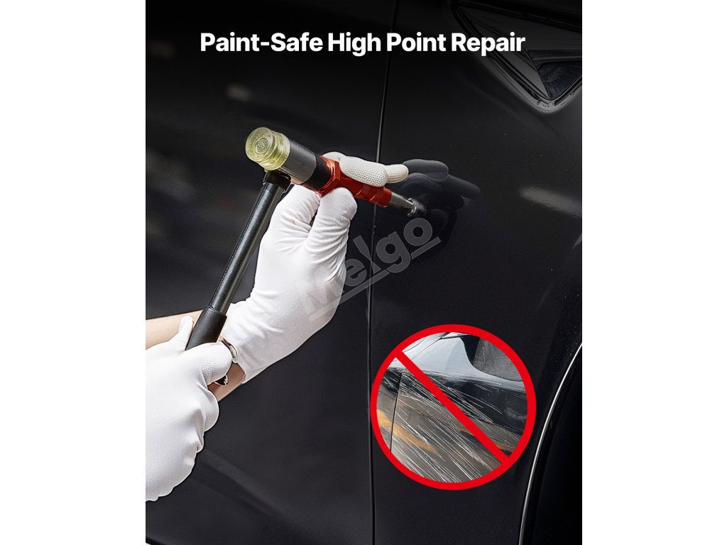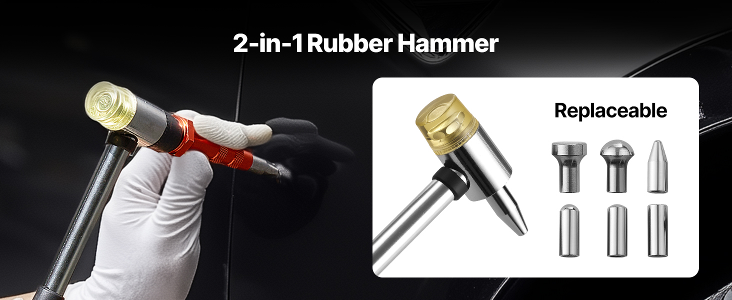 Táto súprava na odstraňovanie preliačin obsahuje gumové kladivo s mäkkou hlavou na poklepávanie, vyrovnávanie a vyhladzovanie. Jeho pružná hlava šetrí váš lak a zároveň pomáha dokončiť prácu s opatrnosťou.