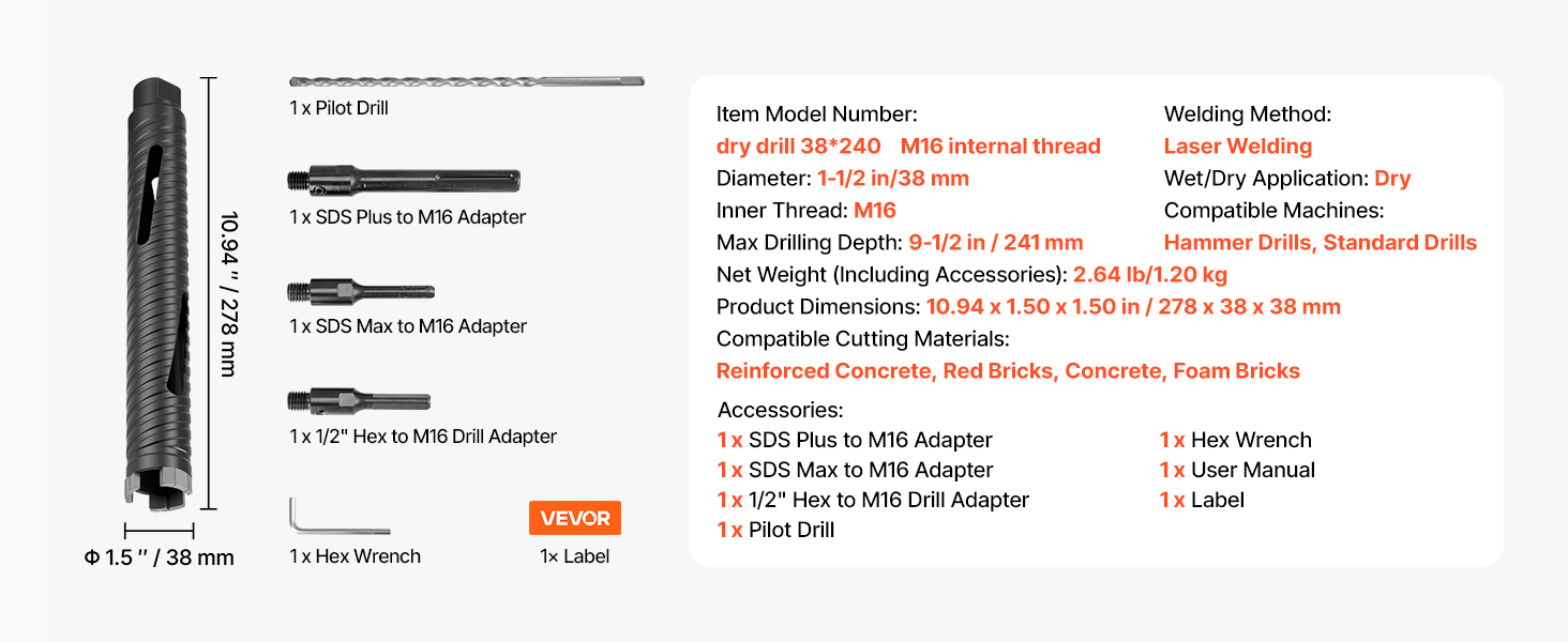 | Číslo modelu položky | suchý vrták 38*240 M16 vnútorný závit |