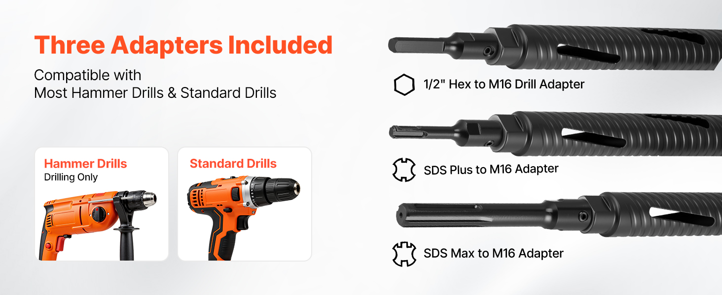 Náš diamantový vrták na suché korunky obsahuje tri adaptéry na jednoduchú kompatibilitu s vrtákmi SDS Plus, SDS Max a šesťhrannými vrtákmi 1/2". Nie je potrebné ďalšie dokupovanie - táto súprava zvládne všetky vaše potreby vŕtania.