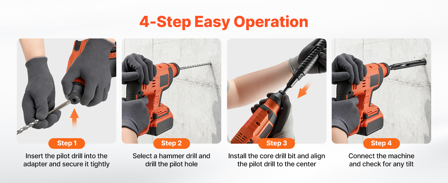 Tento diamantový jadrový vrták sa ľahko používa. Najskôr vložte pilotný vrták do adaptéra a uistite sa, že uhol vrtáka zodpovedá otvoru pre skrutku adaptéra. Pevne utiahnite skrutky. Pilotný vrták musí byť vycentrovaný, pričom odchýlka nesmie byť väčšia ako 1 mm, aby bolo vŕtanie presné.