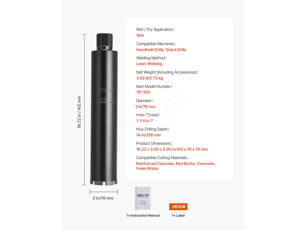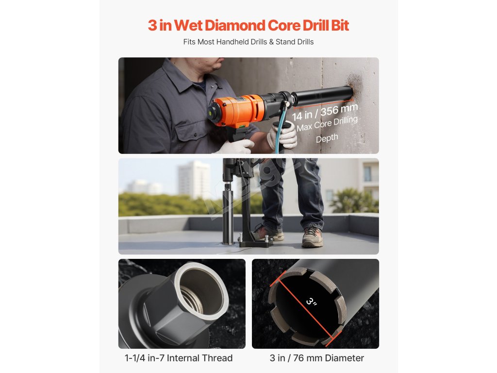 Diamantová korunka 76 mm × 356 mm, vnútorný závit 1-1/4 in-7