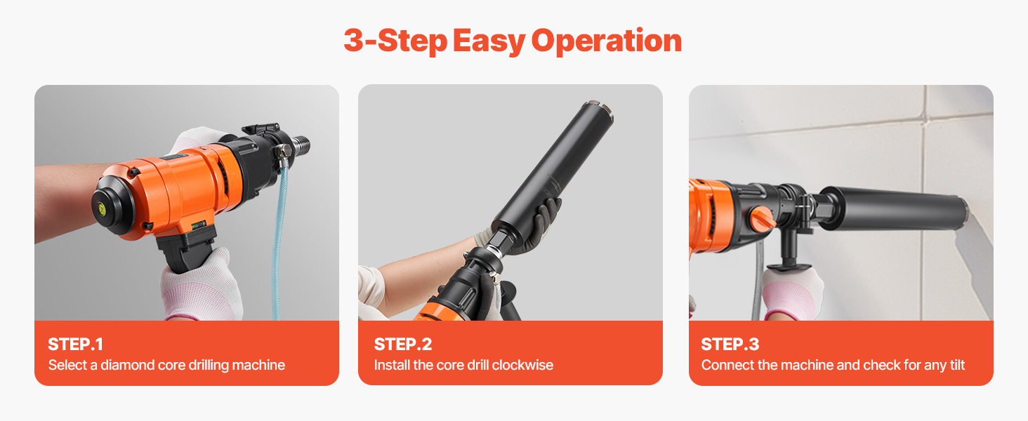 Tieto jadrové vrtáky do betónu sa jednoducho inštalujú a obsluhujú aj pre začiatočníkov. Pre optimálny výkon a výsledky dbajte na to, aby bol vrták počas používania rovný a zarovnaný so stenou otvoru.