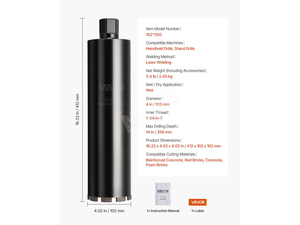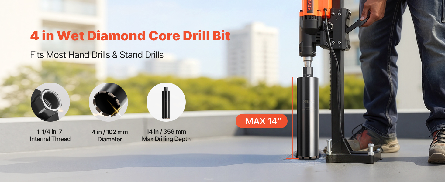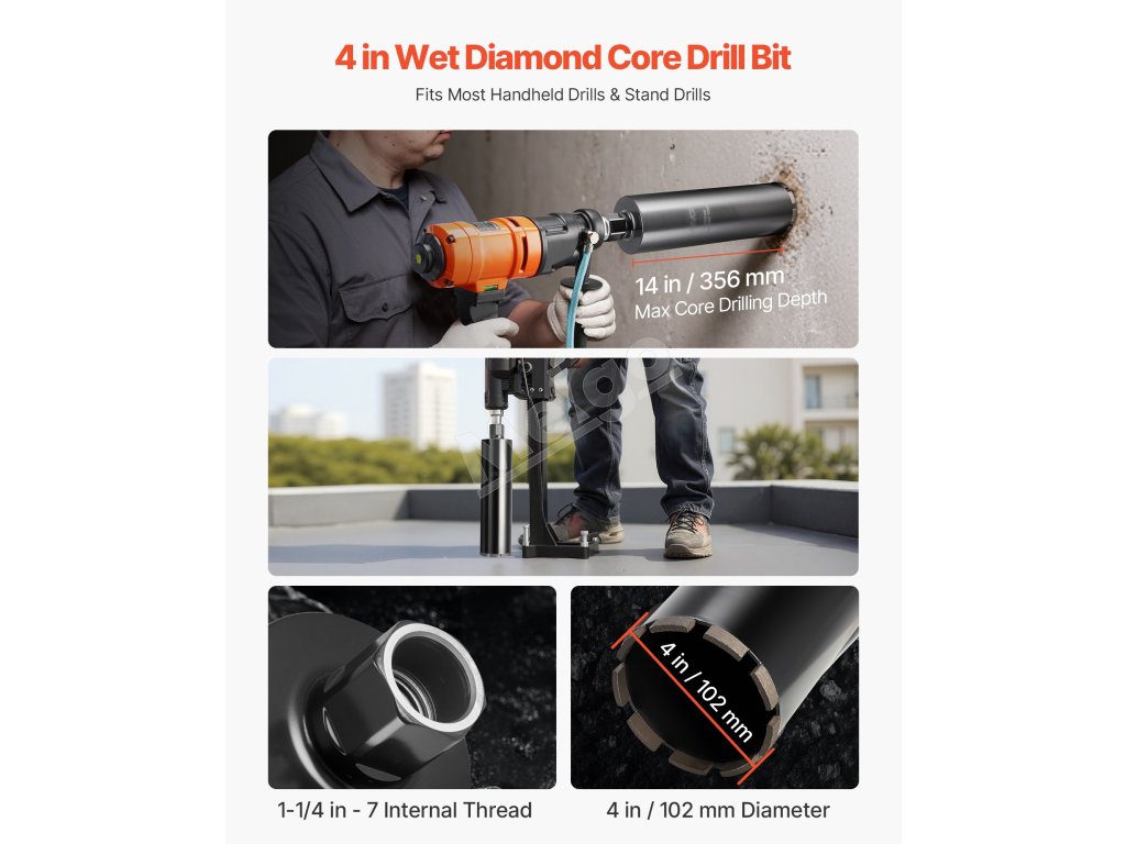 Diamantová korunka na mokro 102 mm × 356 mm, vnútorný závit 1-1/4 in-7