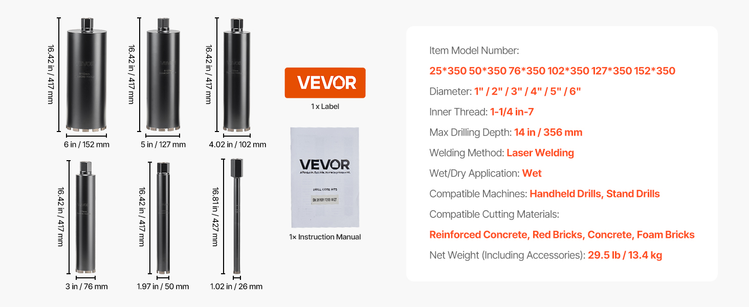 Tento diamantový vrták na mokré korunky obsahuje 1/2/3/4/5/6-palcové vrtáky na rôzne veľkosti otvorov v tvrdých materiáloch, ako sú dlaždice, sklo, mramor a betón. Nie je potrebné kupovať jednotlivé veľkosti - táto súprava zvládne všetky vaše potreby vŕtania.