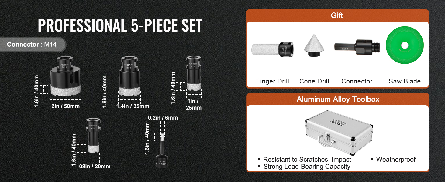 Naša súprava diamantových vrtákov obsahuje 7 rôznych veľkostí vrtákov, prstový vrták 0,8 palca/20 mm, kužeľový vrták 1,4 palca/35 mm, konektor M14 (šesťhranná stopka) a pílový kotúč 4,5 palca/115 mm. To umožňuje profesionálne a presné vŕtanie otvorov. Navyše sa dodáva s kufríkom na náradie na jednoduché prenášanie.
