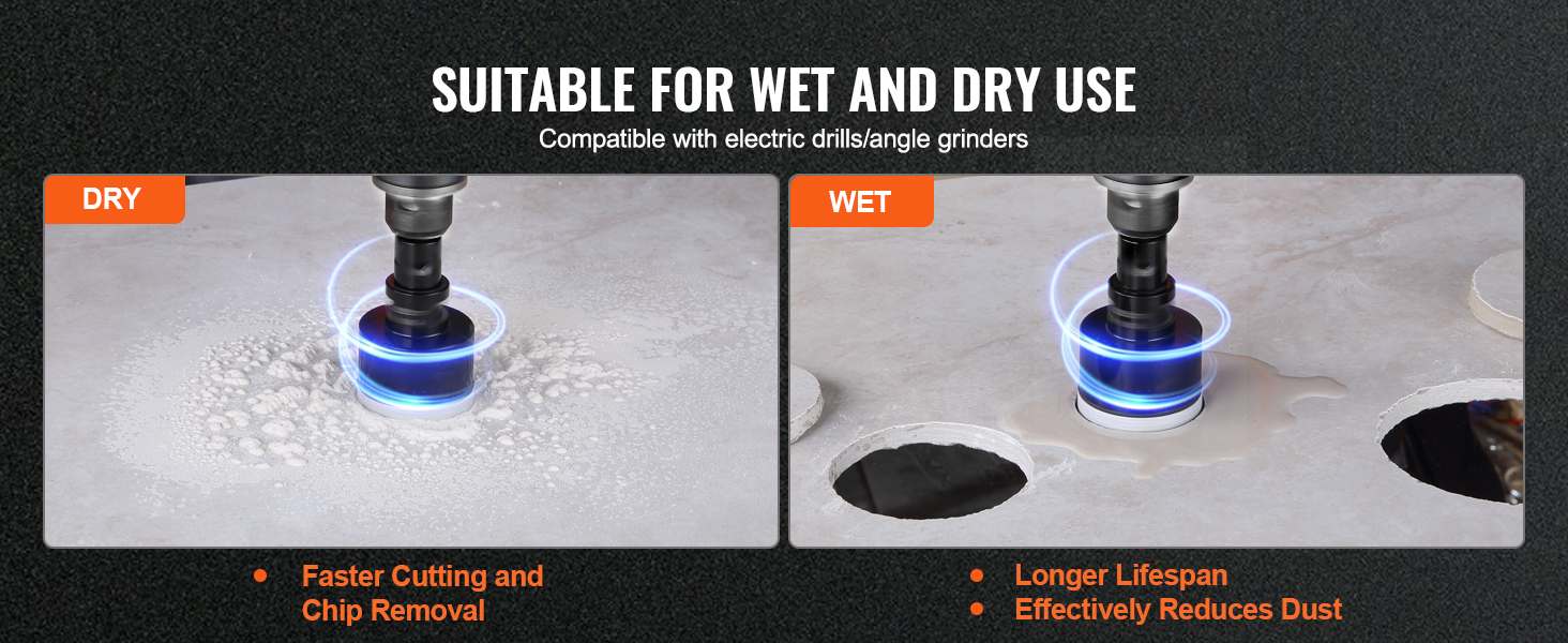V režime suchého rezania zažijete bezkonkurenčnú rýchlosť rezania a odstraňovania triesok, čo výrazne zvyšuje efektivitu práce. V režime mokrého rezania sa diamantové vrtáky vyznačujú odolnosťou, čo zaručuje dlhšiu životnosť s menším množstvom prachu.
