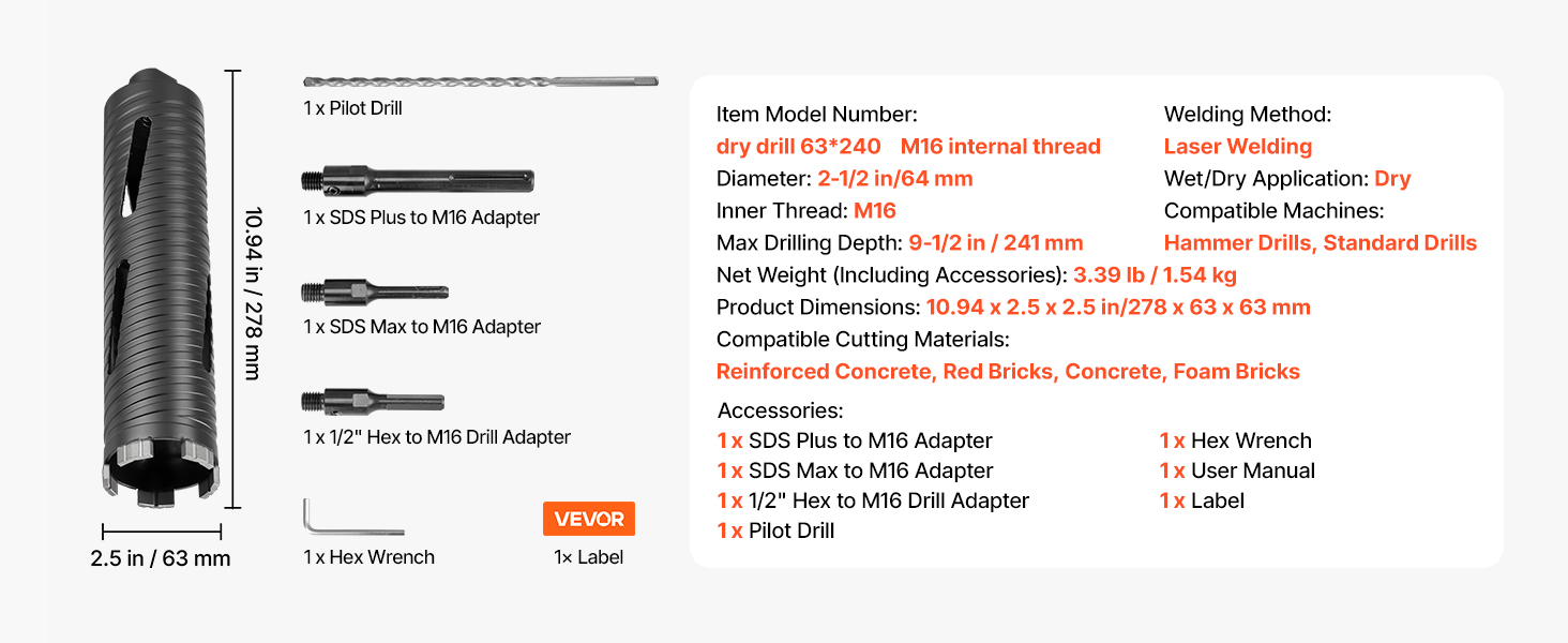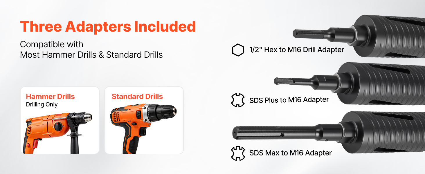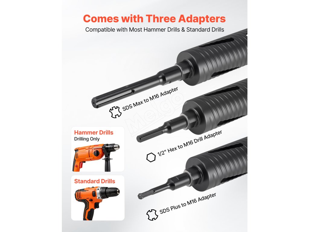 Náš diamantový vrták na suché korunky obsahuje tri adaptéry na jednoduchú kompatibilitu s vrtákmi SDS Plus, SDS Max a šesťhrannými vrtákmi 1/2". Nie je potrebné ďalšie dokupovanie - táto súprava zvládne všetky vaše potreby vŕtania.