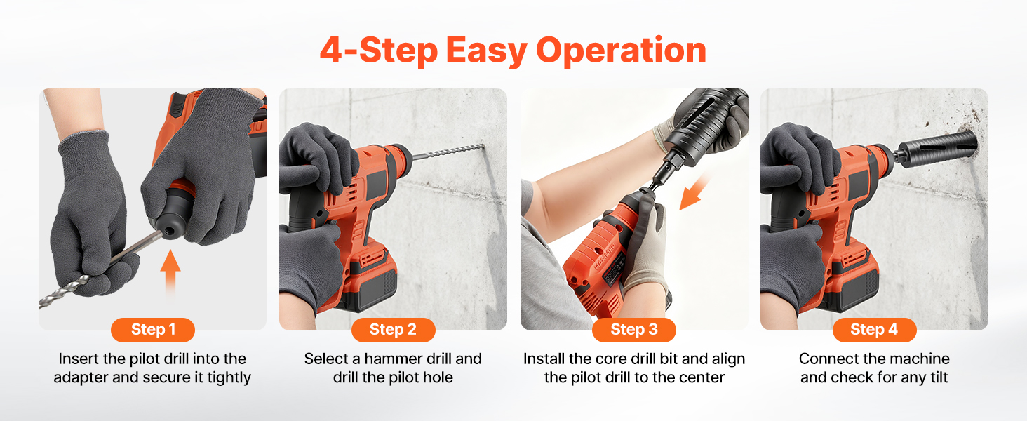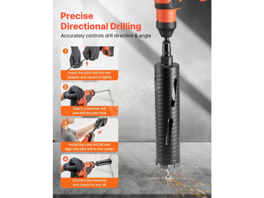 Tento diamantový jadrový vrták sa ľahko používa. Najskôr vložte pilotný vrták do adaptéra a uistite sa, že uhol vrtáka zodpovedá otvoru pre skrutku adaptéra. Pevne utiahnite skrutky. Pilotný vrták musí byť vycentrovaný, pričom odchýlka nesmie byť väčšia ako 1 mm, aby bolo vŕtanie presné.
