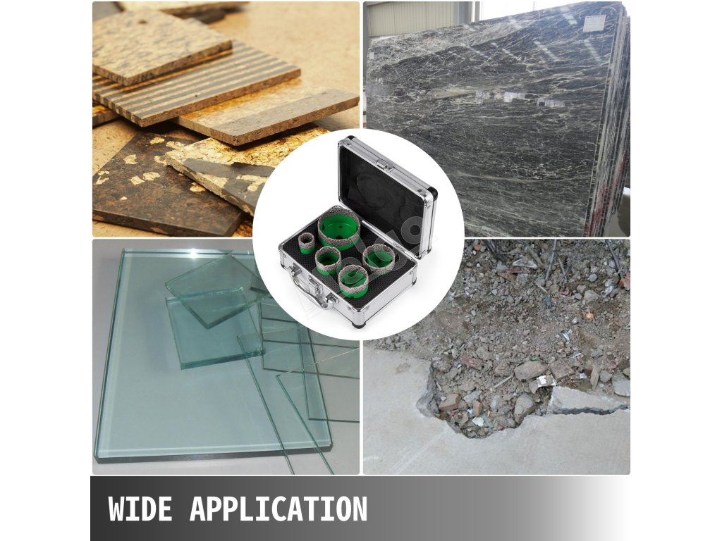 V súprave je 5 vrtákov s priemerom 68 mm, 50 mm, 45 mm, 40 mm, 25 mm, ktorými možno vŕtať otvory rôznych veľkostí podľa rôznych potrieb.