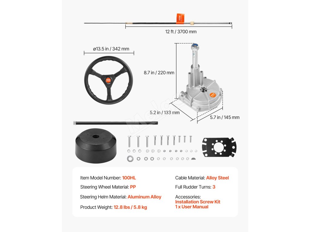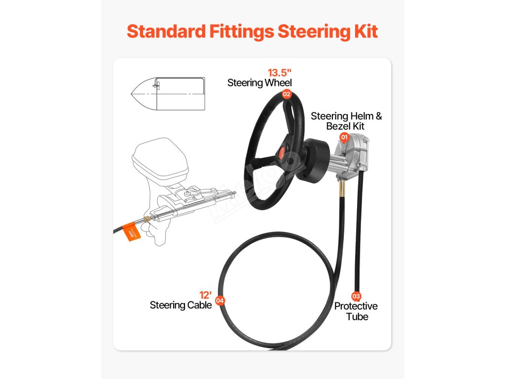 Súprava závesného systému riadenia obsahuje otočné kormidlo, 12 stôp kábla riadenia, 3/4" kužeľovú hriadeľ, 13,5" volant, súpravu rámčeka, upevňovacie skrutky a súpravu skrutiek.