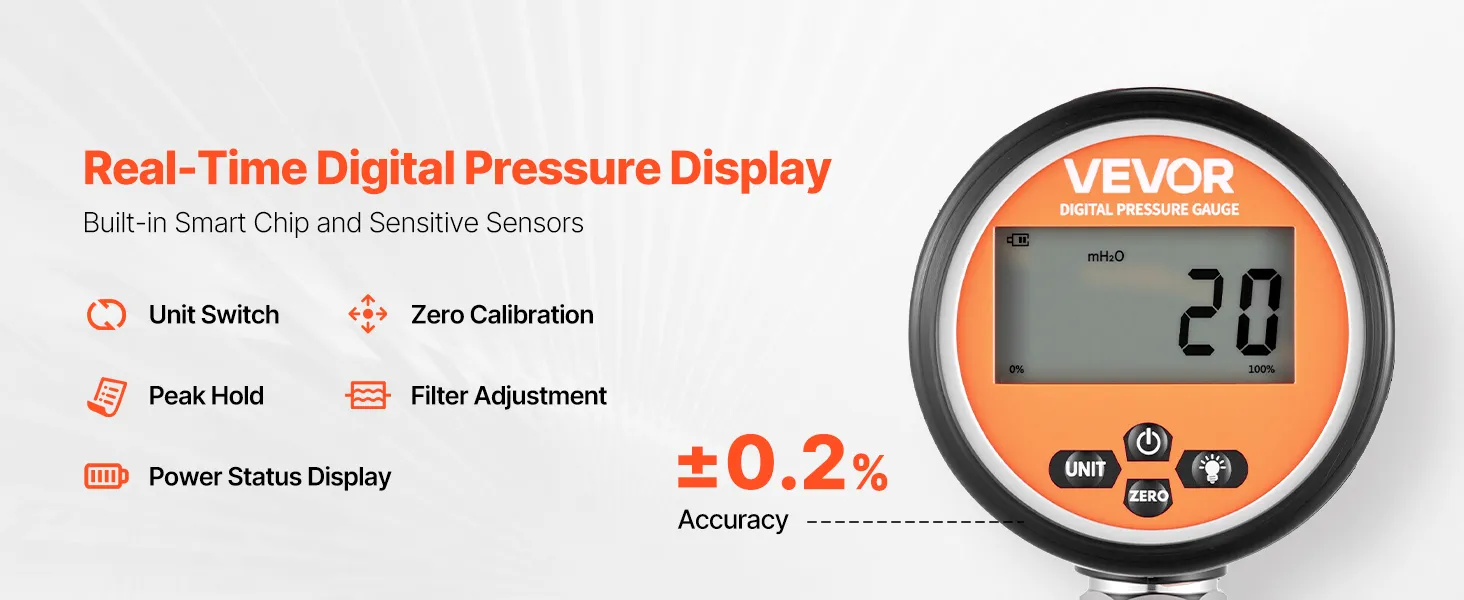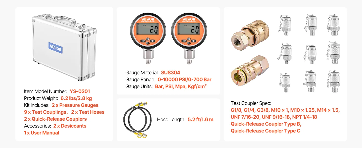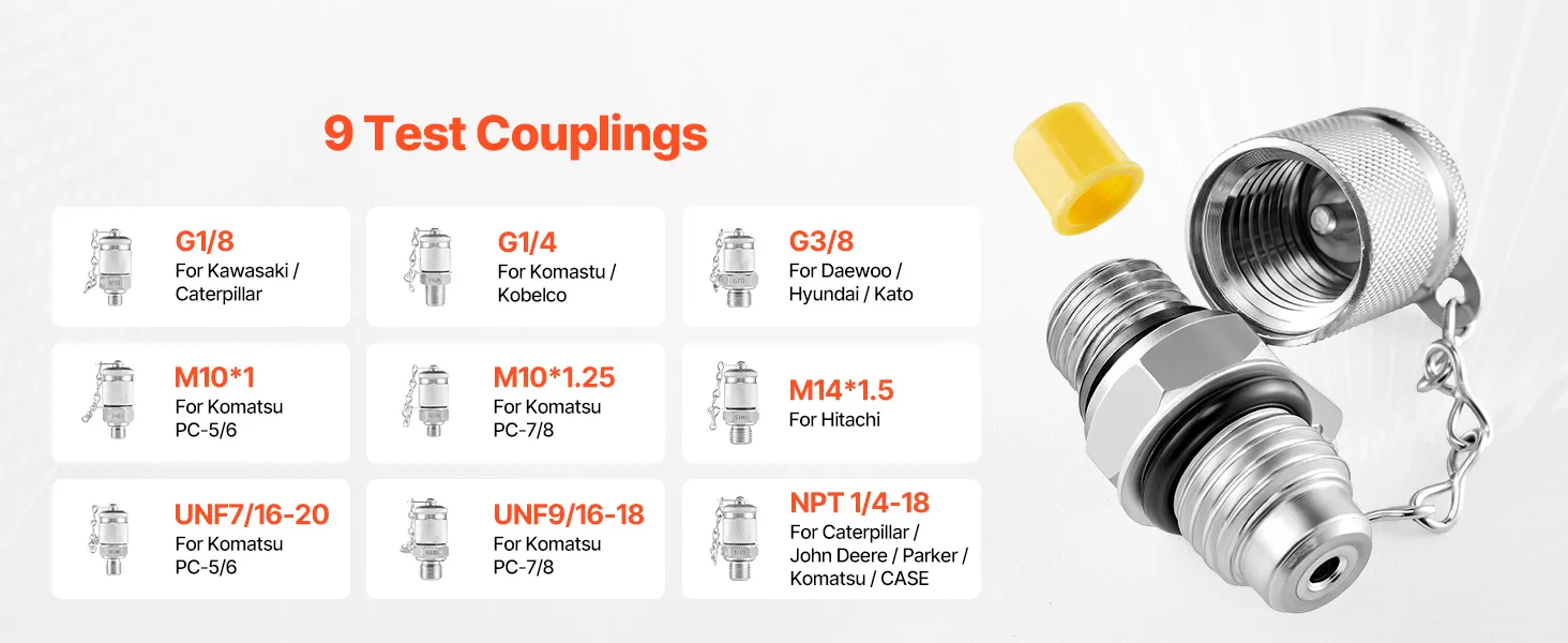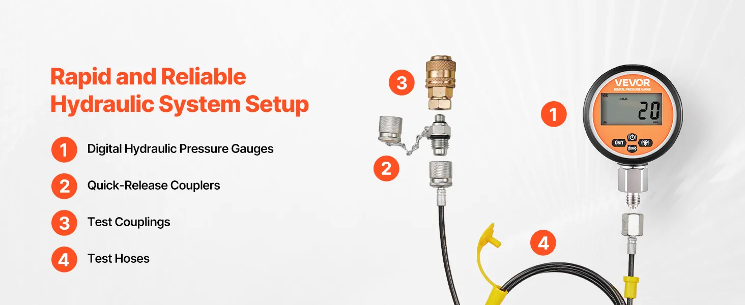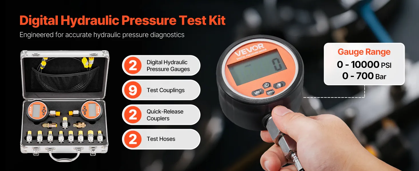 Táto súprava na testovanie hydraulického tlaku obsahuje dva digitálne manometre, ktoré umožňujú dvojbodové testovanie a diagnostiku. Pripojením výstupu čerpadla aj konca akčného člena poskytuje porovnanie tlaku v reálnom čase na rýchle a presné zistenie vnútorných netesností alebo blokád v hydraulických systémoch.