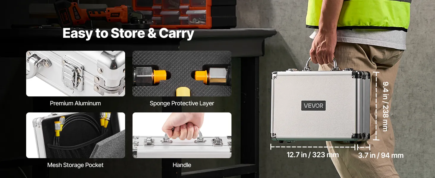 Súprava hydraulického manometra obsahuje 2 vysúšadlá vo vnútri puzdra, ktoré zabraňujú hromadeniu vlhkosti a udržiavajú nástroje bez korózie.