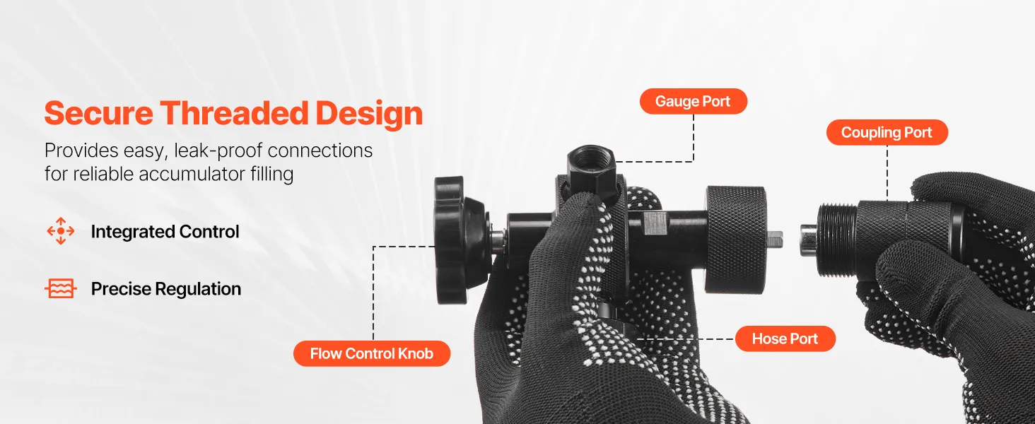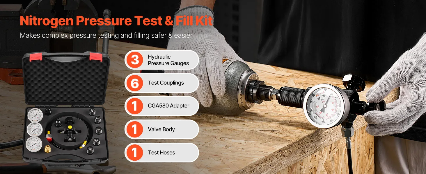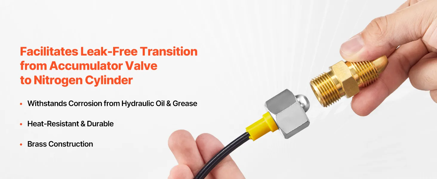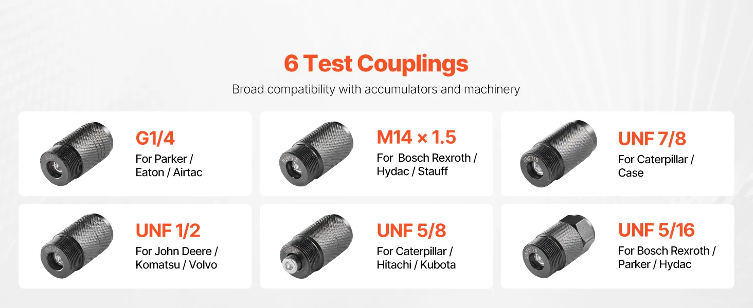Táto súprava na testovanie hydraulického tlaku obsahuje ventil na plnenie dusíkom a tri manometre. Podporuje dvojbodové testovanie, ktoré umožňuje rýchlo a presne lokalizovať poruchy hydraulického systému a zároveň zabezpečuje včasnú údržbu hydraulických akumulátorov.