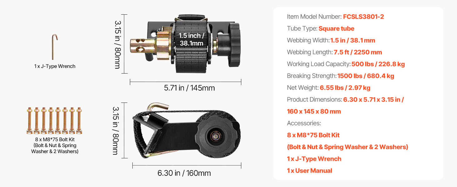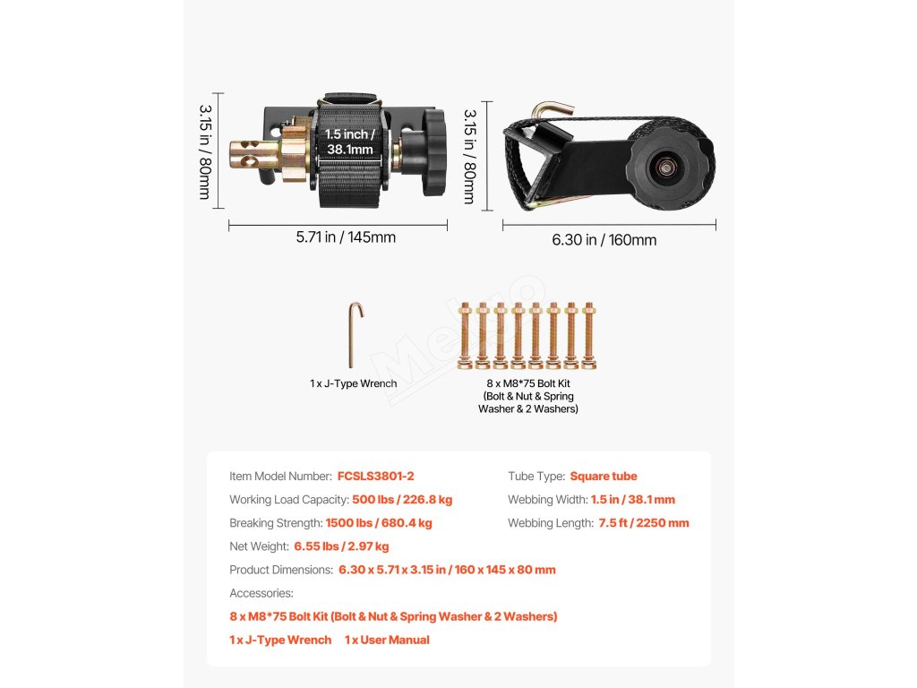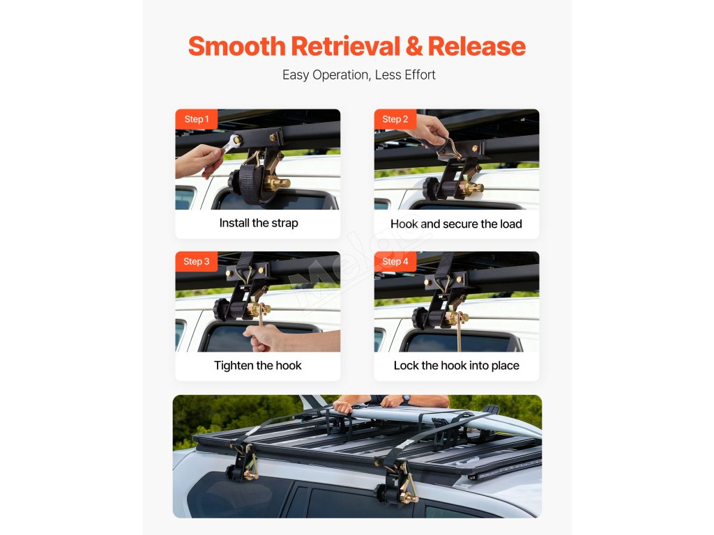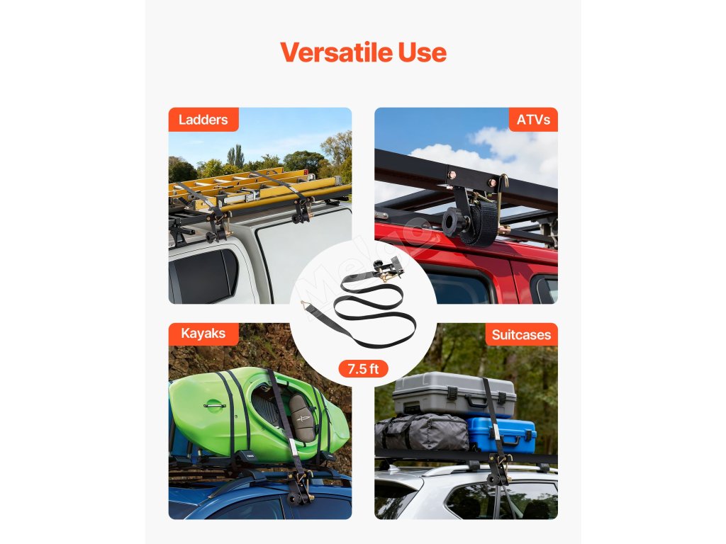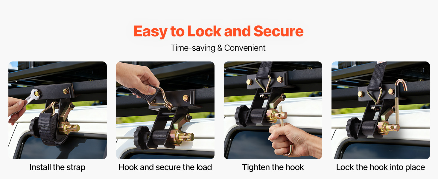 Každý 7,4 ft vysokopevnostný rebríkový stojanový popruh sa spája s robustnou sponou. Systém pomáha odolávať uvoľneniu na hrboľatých cestách a pri rýchlosti, čím udrží váš náklad pekne na mieste.