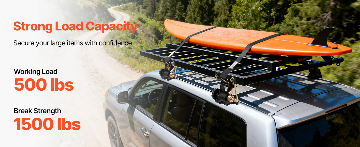 Tieto rebríkové račňové popruhy zvládajú pracovné zaťaženie 500 lb a pevnosť pri pretrhnutí 1 500 lb. Pomáhajú pripevniť dlhé rebríky alebo ťažký výstroj k strešnému nosiču, aby ste sa mohli stabilnejšie prepravovať po diaľnici.
