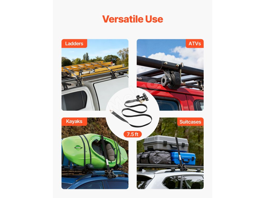 Tieto rebríkové račňové popruhy zvládajú pracovné zaťaženie 500 lb a pevnosť pri pretrhnutí 1 500 lb. Pomáhajú pripevniť dlhé rebríky alebo ťažký výstroj k strešnému nosiču, aby ste sa mohli stabilnejšie prepravovať po diaľnici.