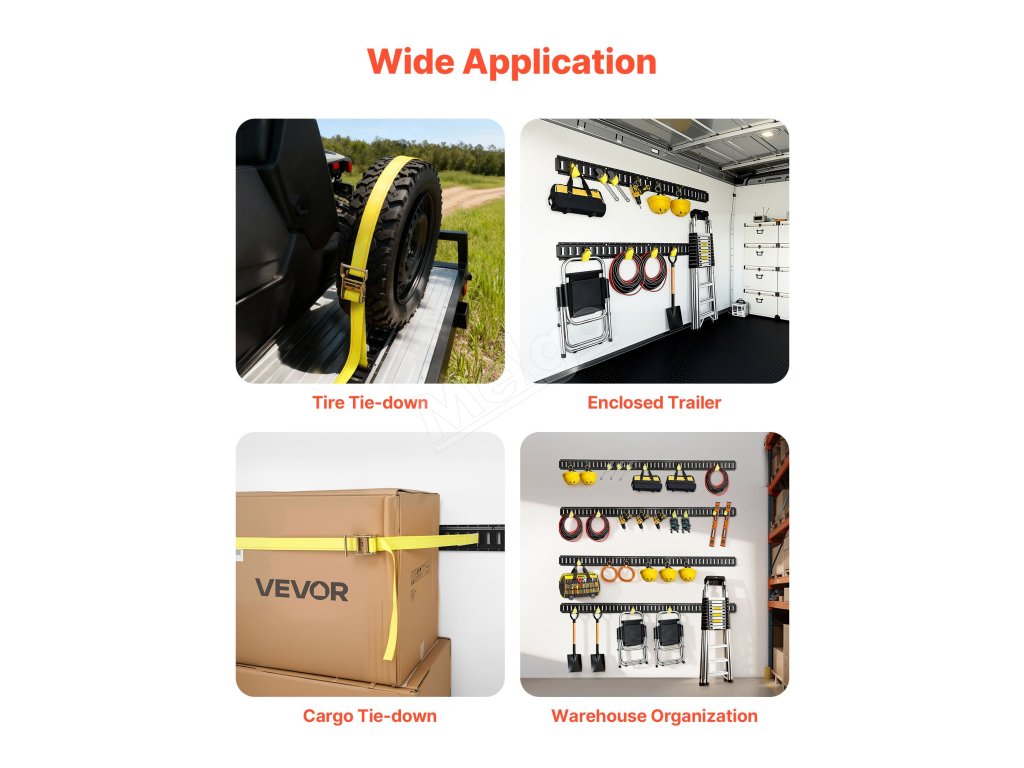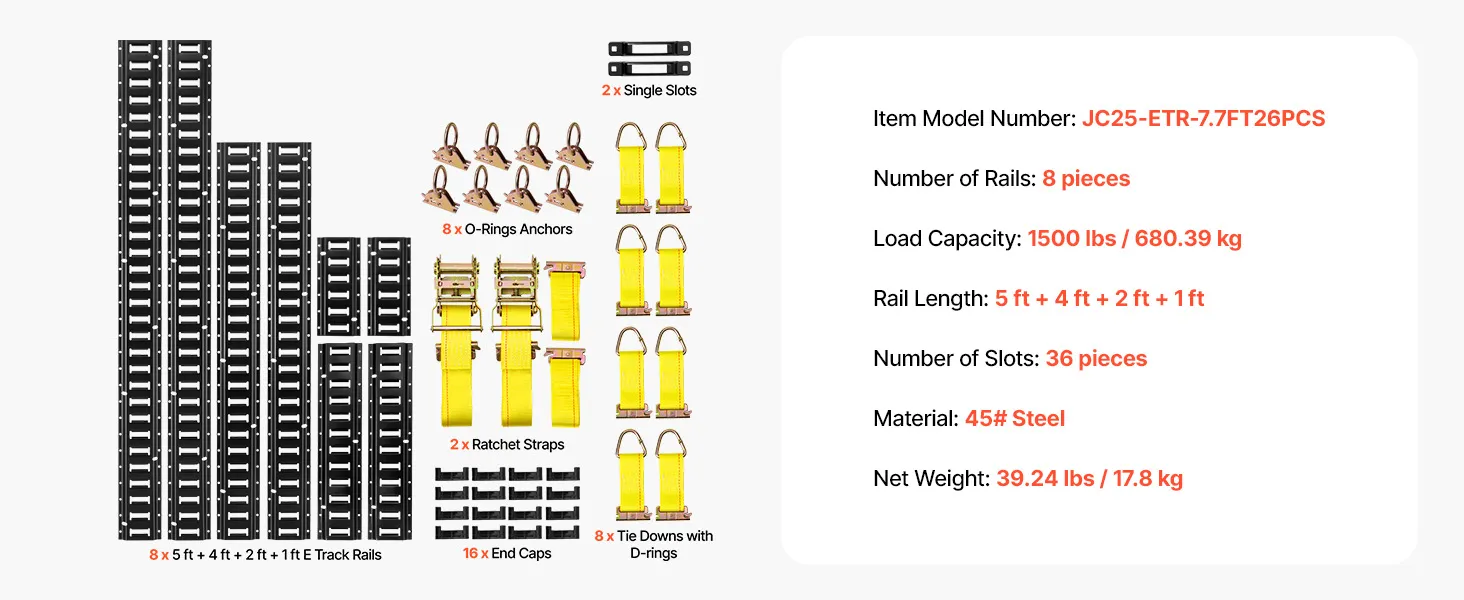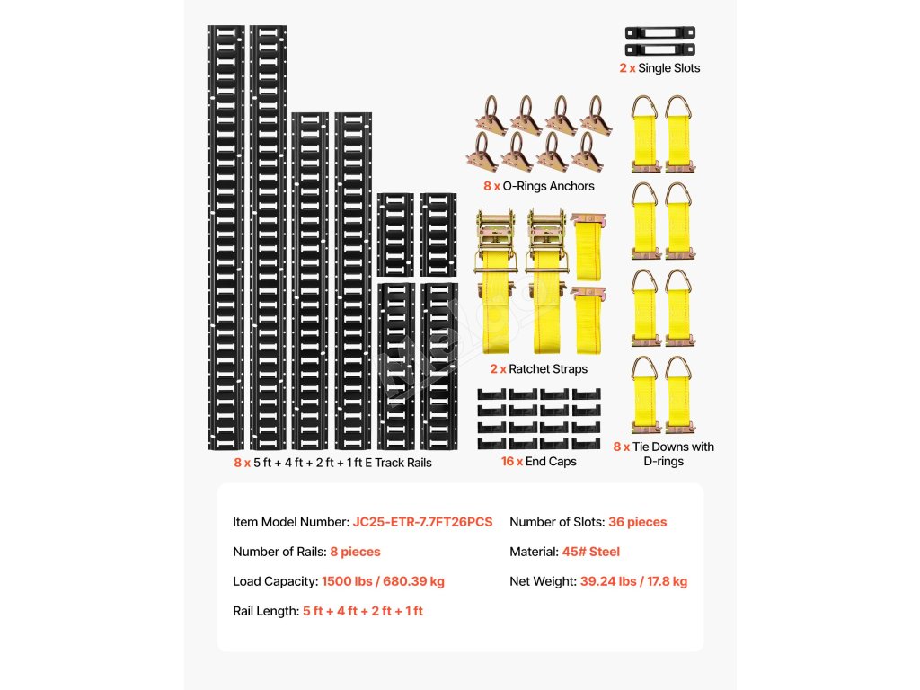 Sada e-track lišt 8 ks (1,5m+1,2m+0,6m+0,3m), 36 dielov, 2 popruhy