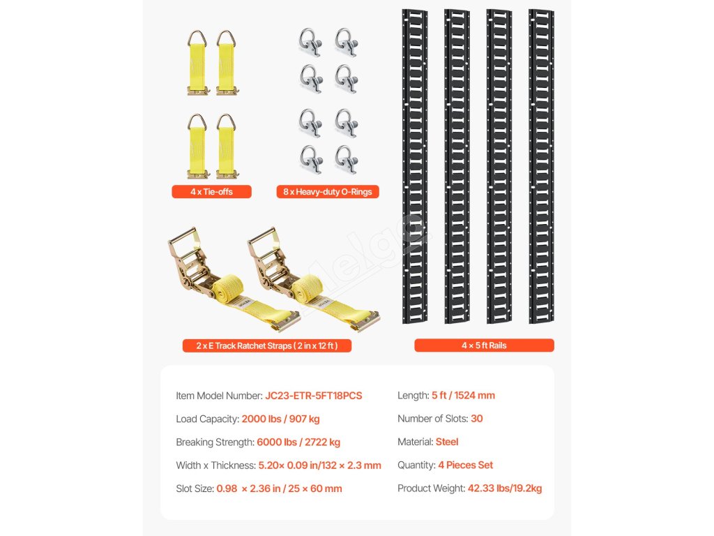 Sada 4×5' e-track lišt s 8 o-ring, 4 d-krúžky, 2 popruhy, 2000 lbs