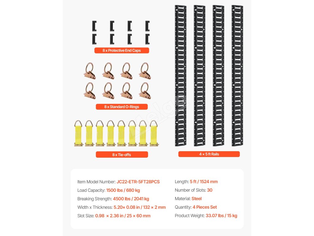 Sada e-track lišt 4×152.4 cm, 30 dielov, 8 o-krúžkov, 8 koncoviek