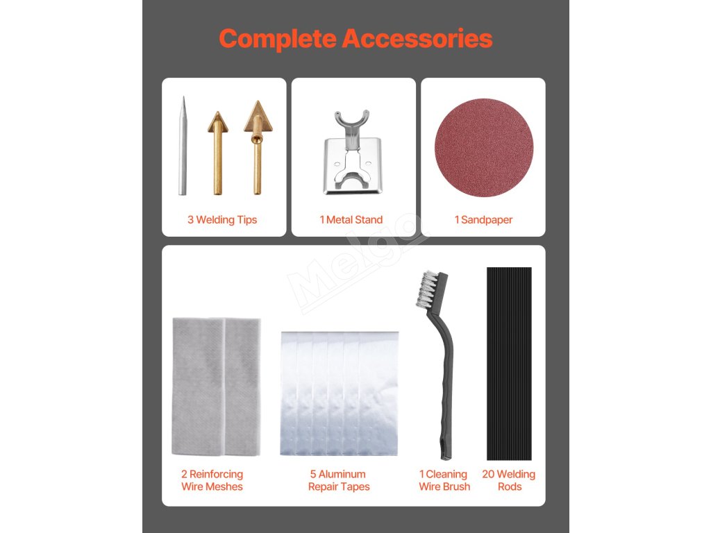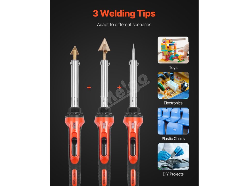Ľahko opravujte plastové predmety pomocou našej 60W/100W zváračky plastov s dvojitým výkonom! Vďaka rýchlemu zahrievaniu, 3 zváracím hrotom, 20 zváracím tyčiam a kompletnej súprave príslušenstva táto spájkovačka bez námahy splní vaše potreby pri opravách plastov - ideálna na palubné dosky, kajaky, nárazníky áut, hračky, elektroniku atď.