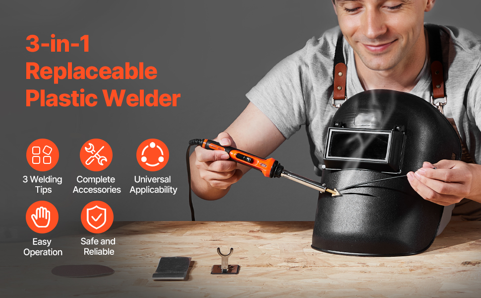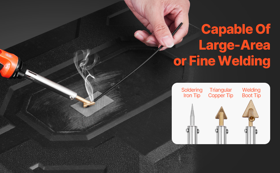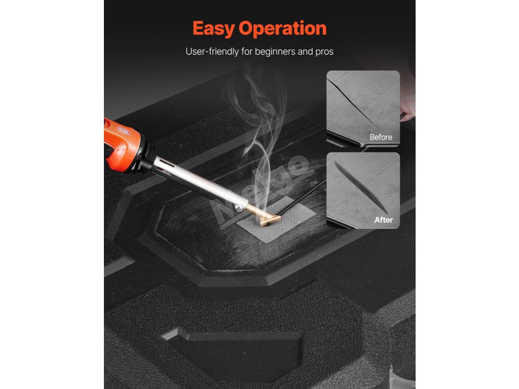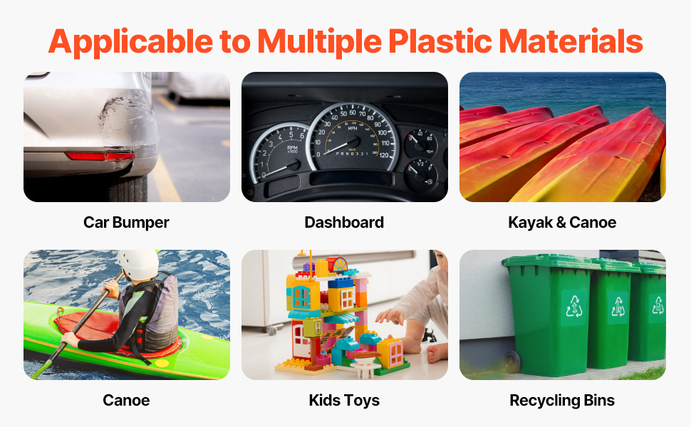 Či už ide o automobilové nárazníky, prístrojové dosky, kajaky, elektronický plášť, detské hračky alebo odpadkové koše, táto zváračka plastov s hrotom na spájkovanie si ľahko poradí so všetkým, čo z nej robí vášho všestranného pomocníka pri opravách.