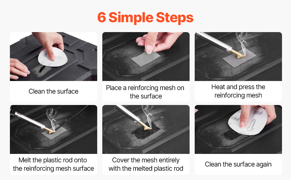 Dosiahnite spoľahlivé opravy plastov v 6 jednoduchých krokoch: Od prípravy povrchu až po tavenie tyče je každý krok jednoduchý a ľahko zvládnuteľný. (Pri prvom spustení sa môže objaviť dym spôsobený tavidlom na hrote; to je normálne. Používajte v dobre vetranom priestore a noste masku.)