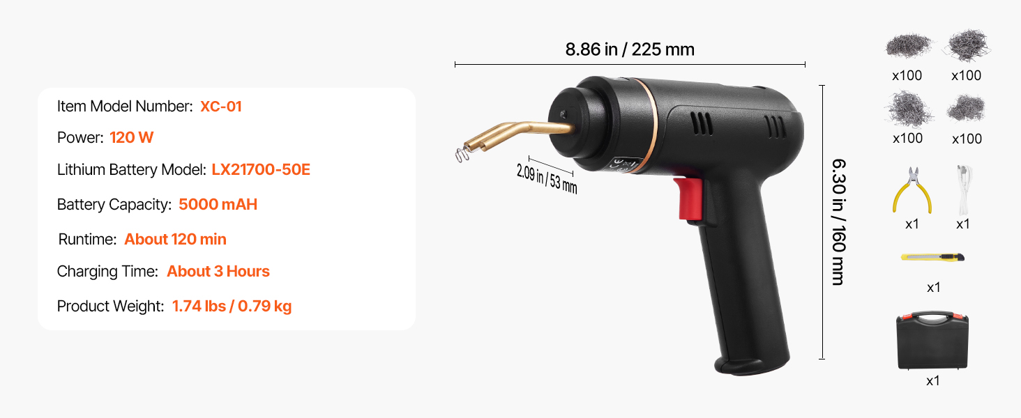 Opravujte plastové predmety bez námahy s našou 120 W akumulátorovou zváračkou na plasty! Vďaka rýchlemu zahrievaniu, 400 ks horúcich spôn, kompletnej sade príslušenstva a ochrane proti preťaženiu/prepätiu, zváračka na horúce spony bez námahy spĺňa požiadavky na opravu plastov a je ideálna pre rôzne scenáre opráv plastov!