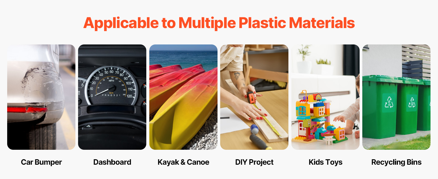 Či už ide o nárazníky áut, palubné dosky, kajaky, projekty DIY alebo detské hračky, tento nabíjateľný nástroj na zváranie plastov to všetko zvládne bez námahy. Jednoduché pokyny na identifikáciu materiálu vás priamo dovedú k optimálnym výsledkom pri každom zváraní.