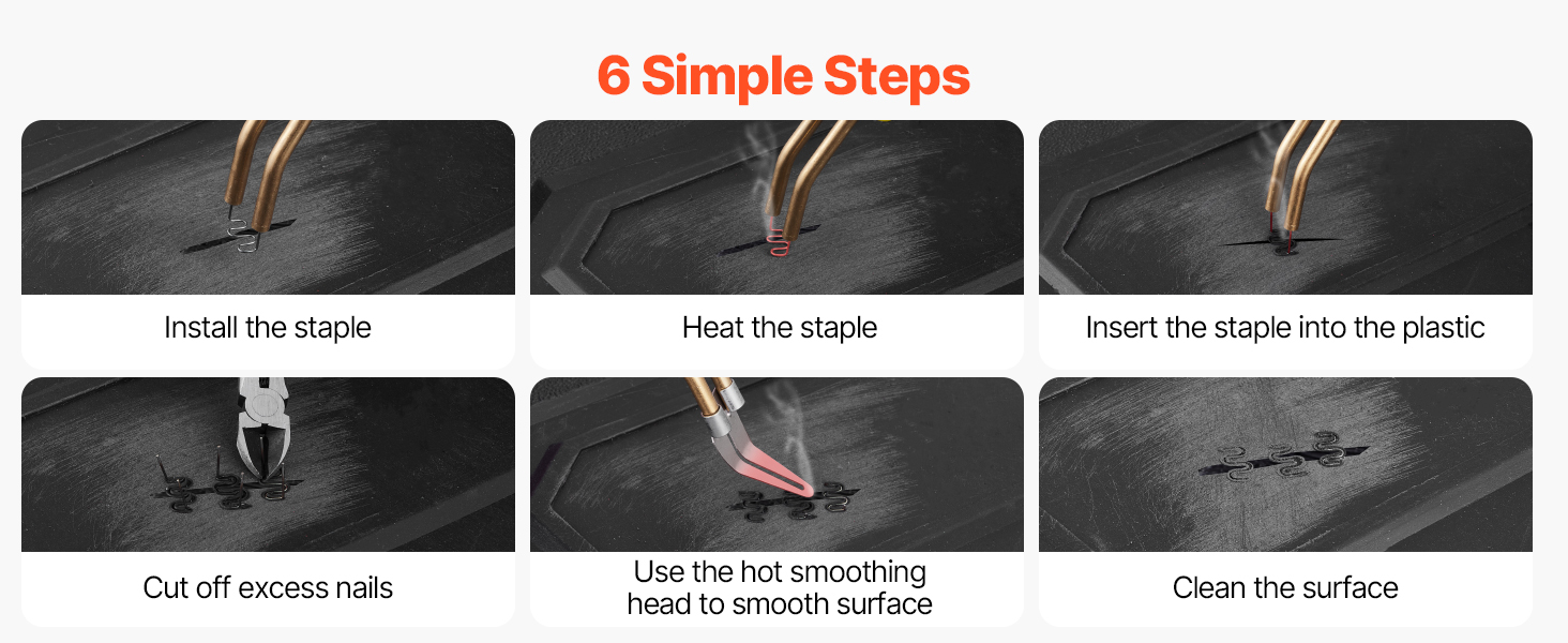 Dosiahnite spoľahlivé opravy plastov len v 4 krokoch. Pripravte si nástroje, postupujte podľa pokynov a rýchlo to zvládnete – ideálne pre začiatočníkov aj odborníkov. Stačí nainštalovať sponu, zahrievať ju, vložiť do plastu a odrezať prebytočné konce pre hladký povrch.