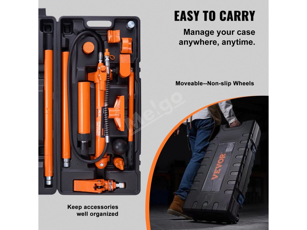 Úložný kufor pomáha udržiavať všetky nástroje organizované a chránené. Je vyrobené z odolných materiálov. Všetky komponenty sa do samotného kufríka pohodlne zmestia. Vďaka tomu je náradie počas prepravy v bezpečí a jednoducho sa prenáša a skladuje. Okrem toho kufor pomáha udržiavať toto náradie vo vynikajúcom stave. Pomáha predchádzať strate alebo poškodeniu nástrojov. Túto funkciu preto môžu využívať profesionálni používatelia aj domáci majstri. Súprava VEVOR 10 Ton Porta Power Kit poskytuje kompletné riešenie. Všetky nástroje sú ľahko prístupné a zároveň dobre chránené.