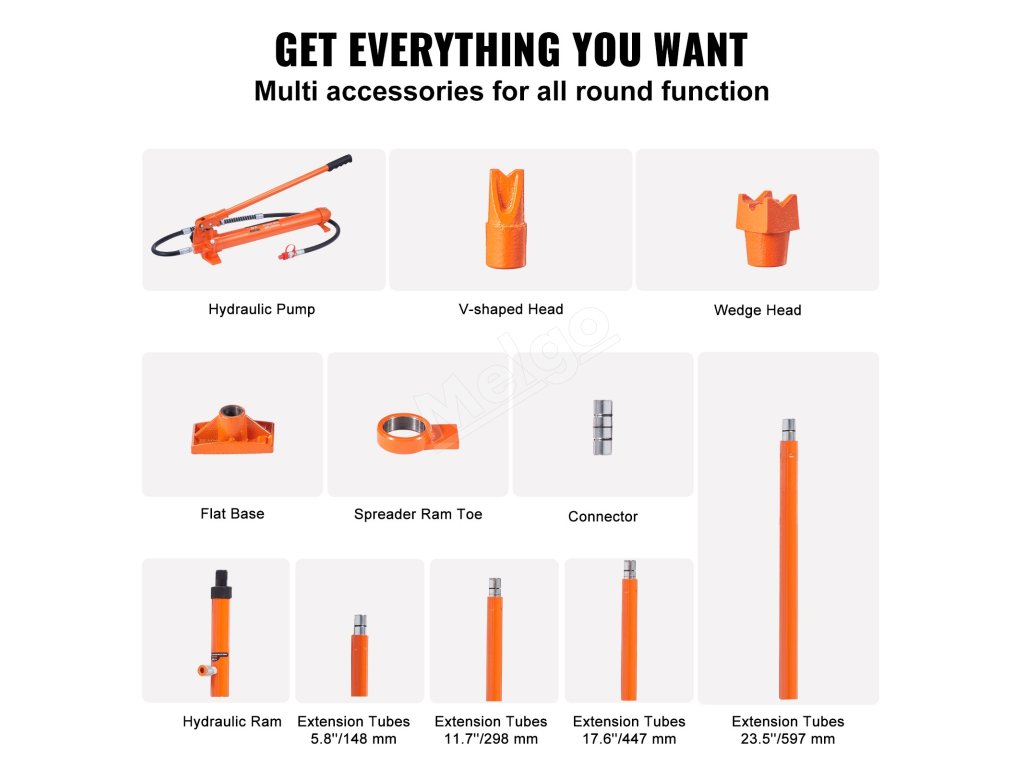 Tieto predlžovacie tyče a príslušenstvo sú súčasťou náradia na opravu rámu automobilu VEVOR. Obsahujú tyče rôznych dĺžok, napríklad 3,9 palca, 11,8 palca a 19,7 palca. Možno ich použiť na rôzne úlohy, od tlačenia až po ťahanie. Súprava sa dodáva aj so 4,6-metrovou olejovou trubicou, ktorá zabezpečuje flexibilitu pri používaní. Príslušenstvo umožňuje efektívne vykonávať viacero aplikácií. Dokáže pracovať na mnohých opravách v celom rozsahu napájania. Hodí sa teda na úlohy v automobilovom priemysle, pri práci s ťažkými zariadeniami a pre mechanikov. Ušetríte čas a peniaze, pretože dodávané príslušenstvo poskytuje všetko potrebné v jednom balení.