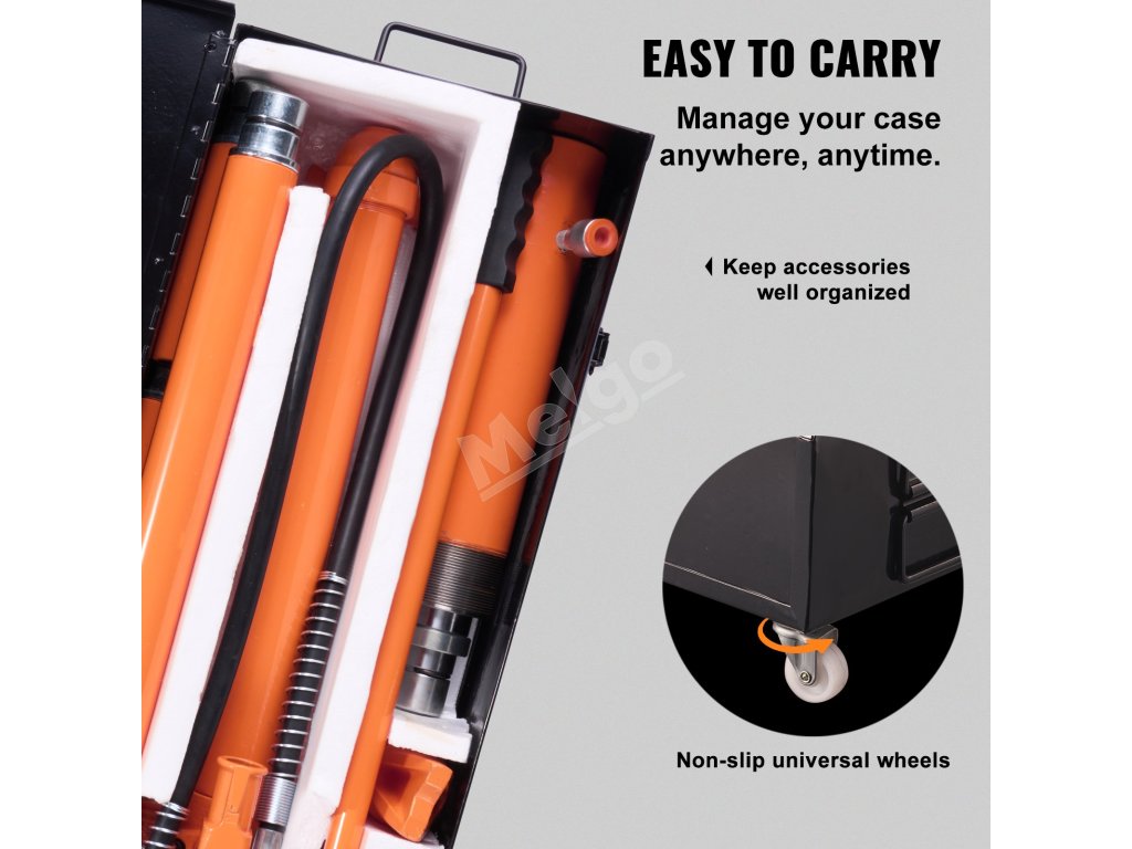 Tento prenosný hydraulický zdvihák má zjednodušený úložný kufor. Vďaka tomu sa hydraulický zdvihák ľahko prepravuje a skladuje. Kufrík je navrhnutý tak, aby bezpečne držal všetky komponenty. Je odolný, vďaka čomu je náradie počas prepravy chránené. Kufrík obsahuje aj rukoväte na jednoduché prenášanie. Táto funkcia je ideálna pre mechanikov, ktorí musia svoje náradie často prenášať. Okrem toho táto funkcia udržiava nástroje usporiadané tak, aby ste mohli nájsť to, čo potrebujete.