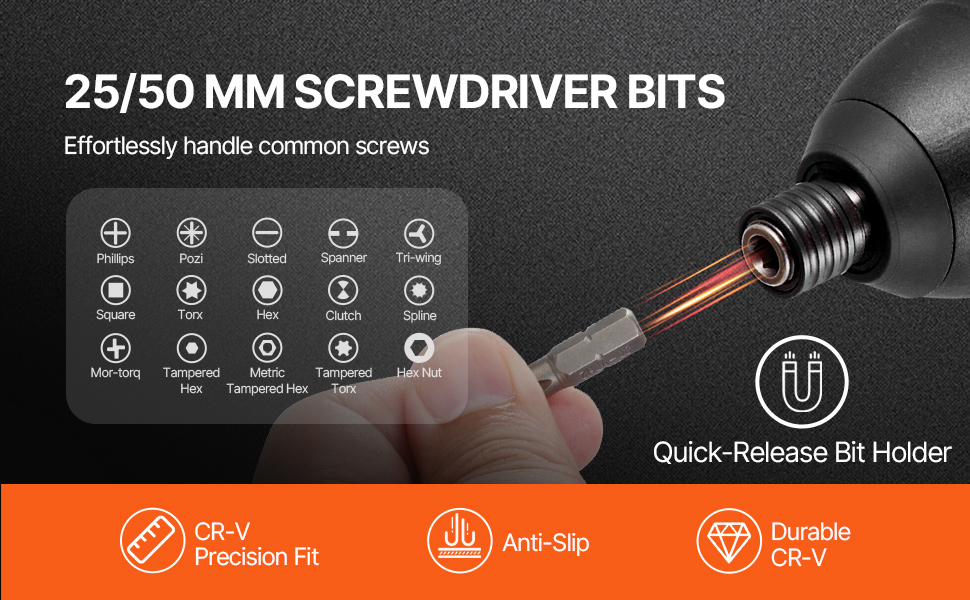 Táto sada skrutkovacích bitov si bez námahy poradí s bežnými skrutkami a maticami. Jej silné CR-V bity poskytujú trvalú odolnosť a zabraňujú skĺznutiu, čím zabezpečujú hladký a spoľahlivý výkon.